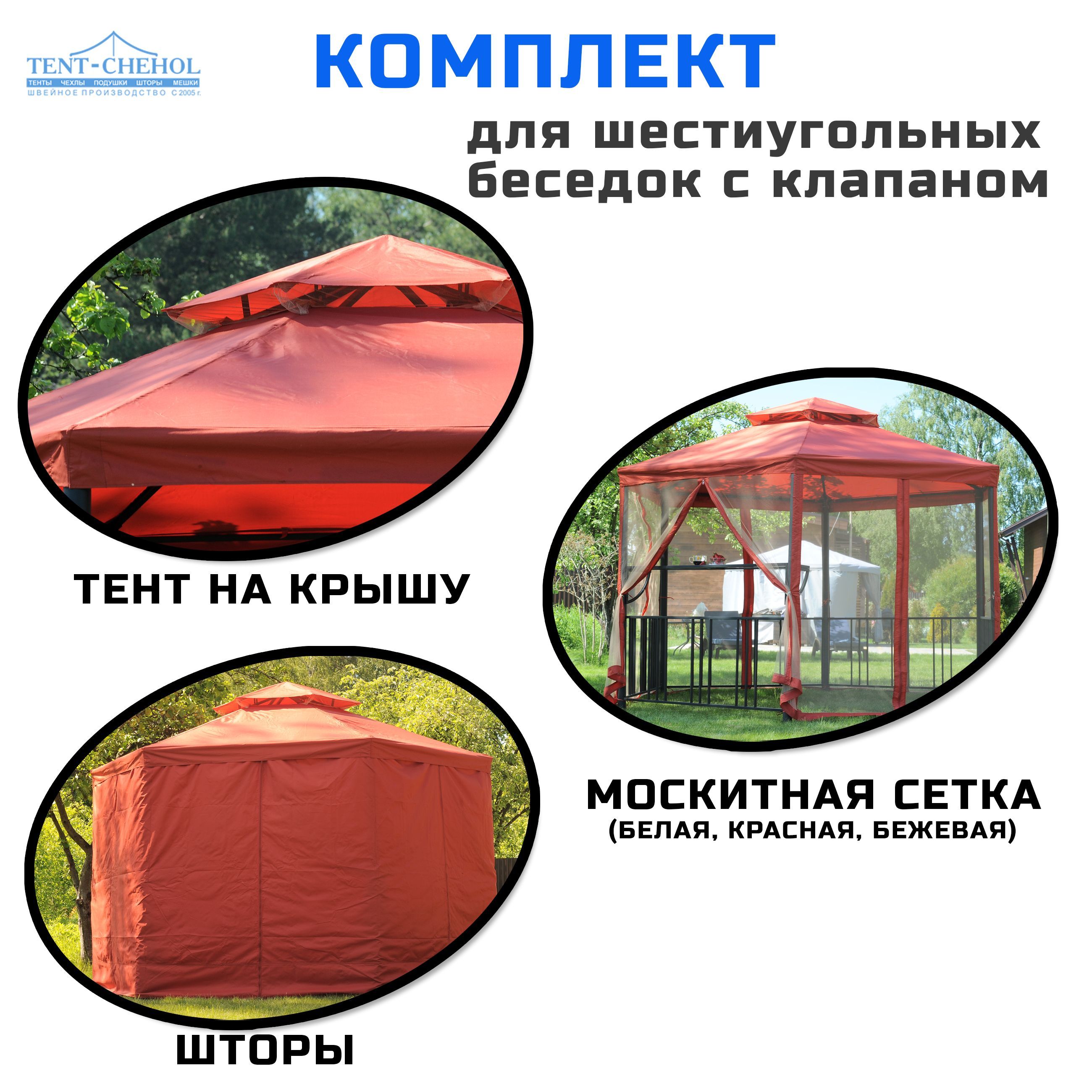 Карточка для заказа комплекта из штор, москитных сеток и тентаЗапасной комплект предназначен для замены покрытия у шестиугольных павильонов (беседок, шатров) Blooma Creola, Ambrose, New York1, Hexagon, Castorama Hexagon Gazebo, Green days и других шестигранных беседок с клапаном на крыше.